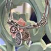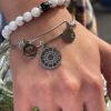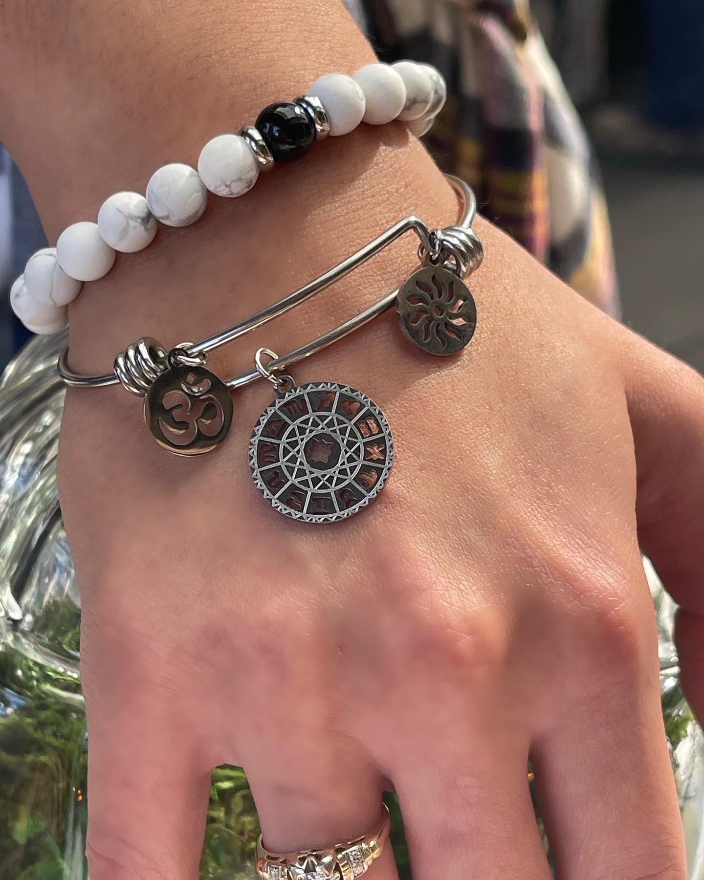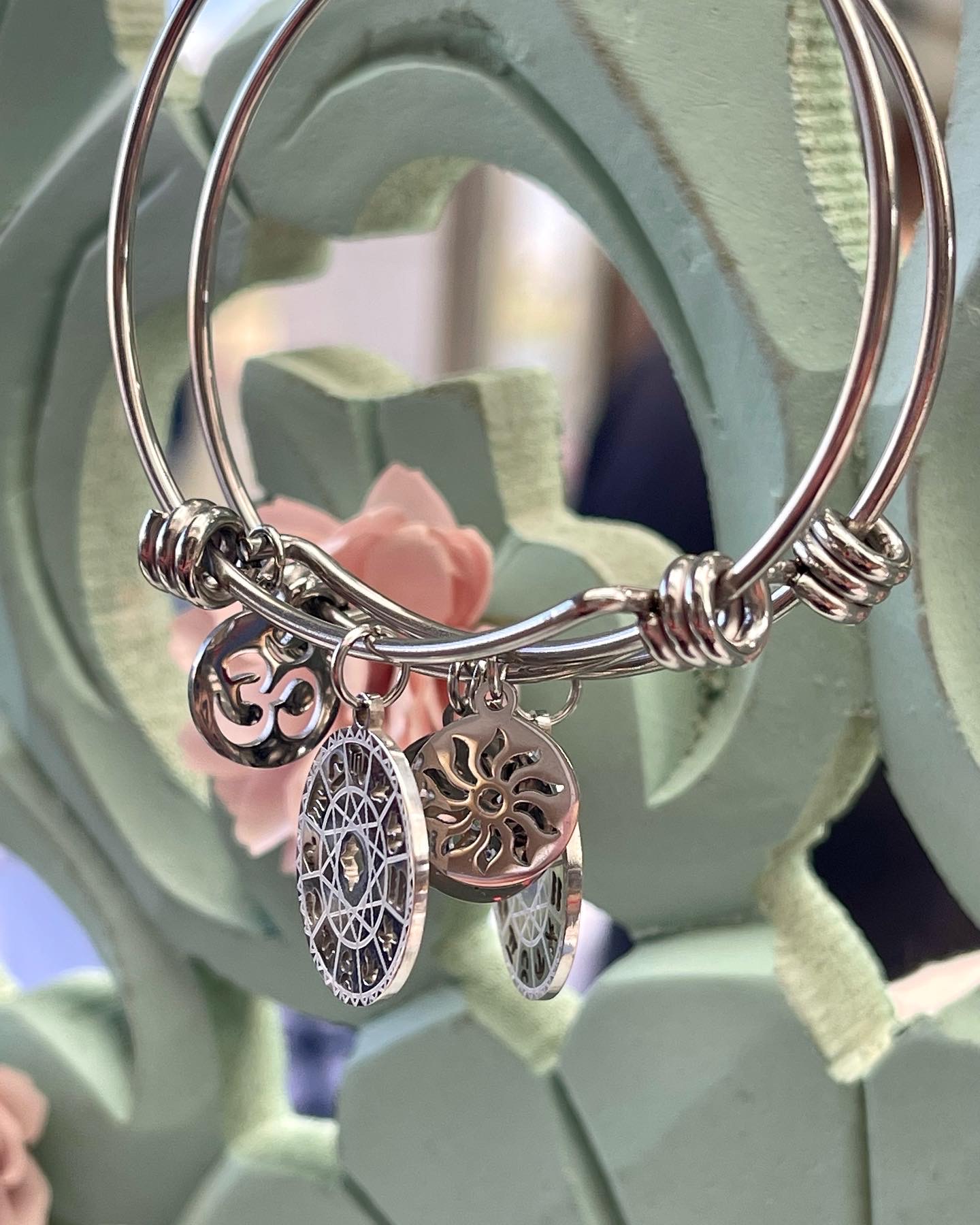 Stainless steel bangle with three stainless steel charms. The charms include an Om symbol, a Sun, and the largest charm is an astrology wheel.