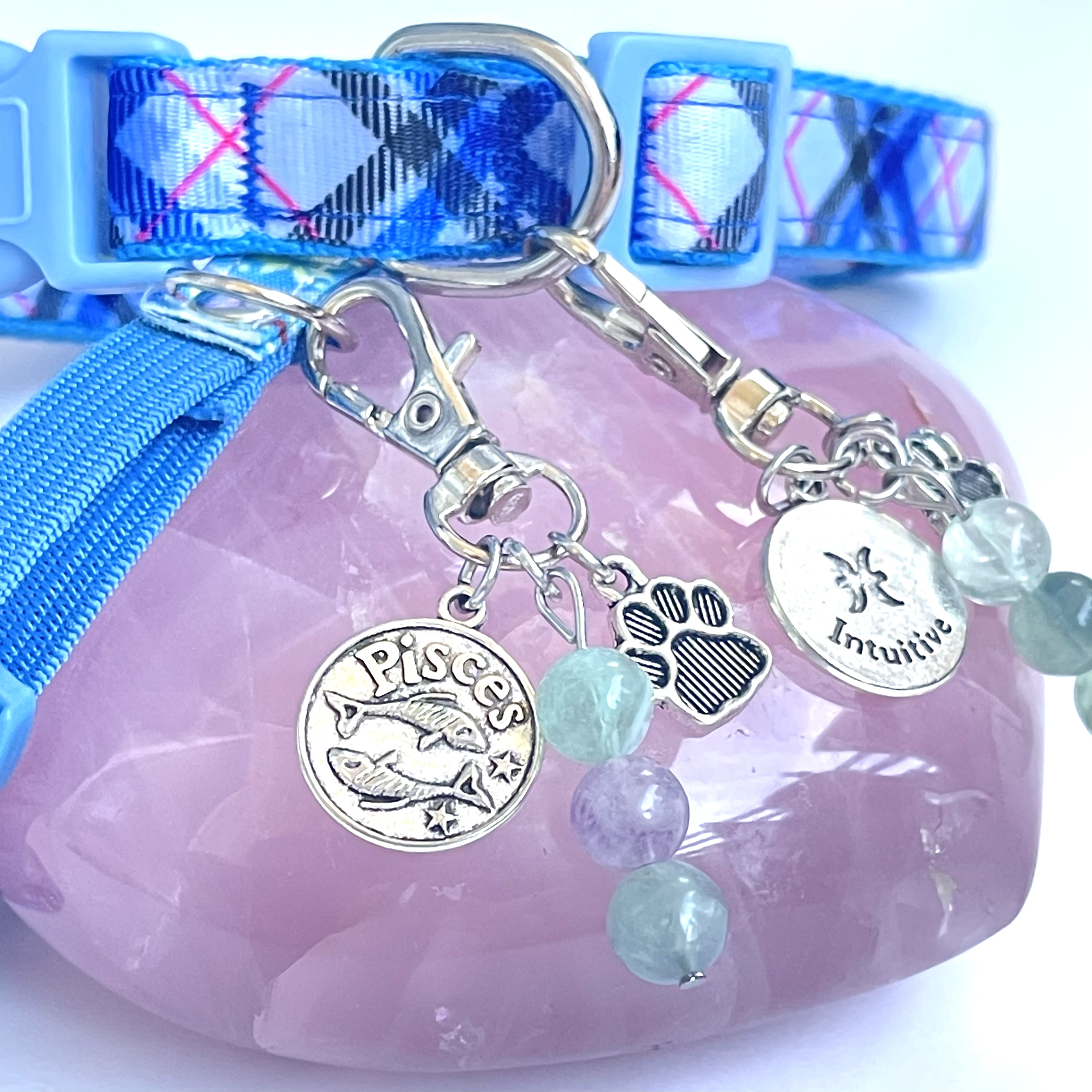 Calling all Pisces furry friends! Show off your pups zodiac sign with our Pisces pet collar charm. The charm features a beautiful depiction of the Pisces zodiac sign, with intricate detailing that is sure to catch the eye. Also adorned with Fluorite representing their zodiac stones. Simply attach the charm to your pet’s collar and let them rock their Pisces pride on their daily walks and adventures. Perfect for those who love astrology and want to show off their pet’s unique personality. Get your Pisces pet collar charm today and let your furry friend shine!