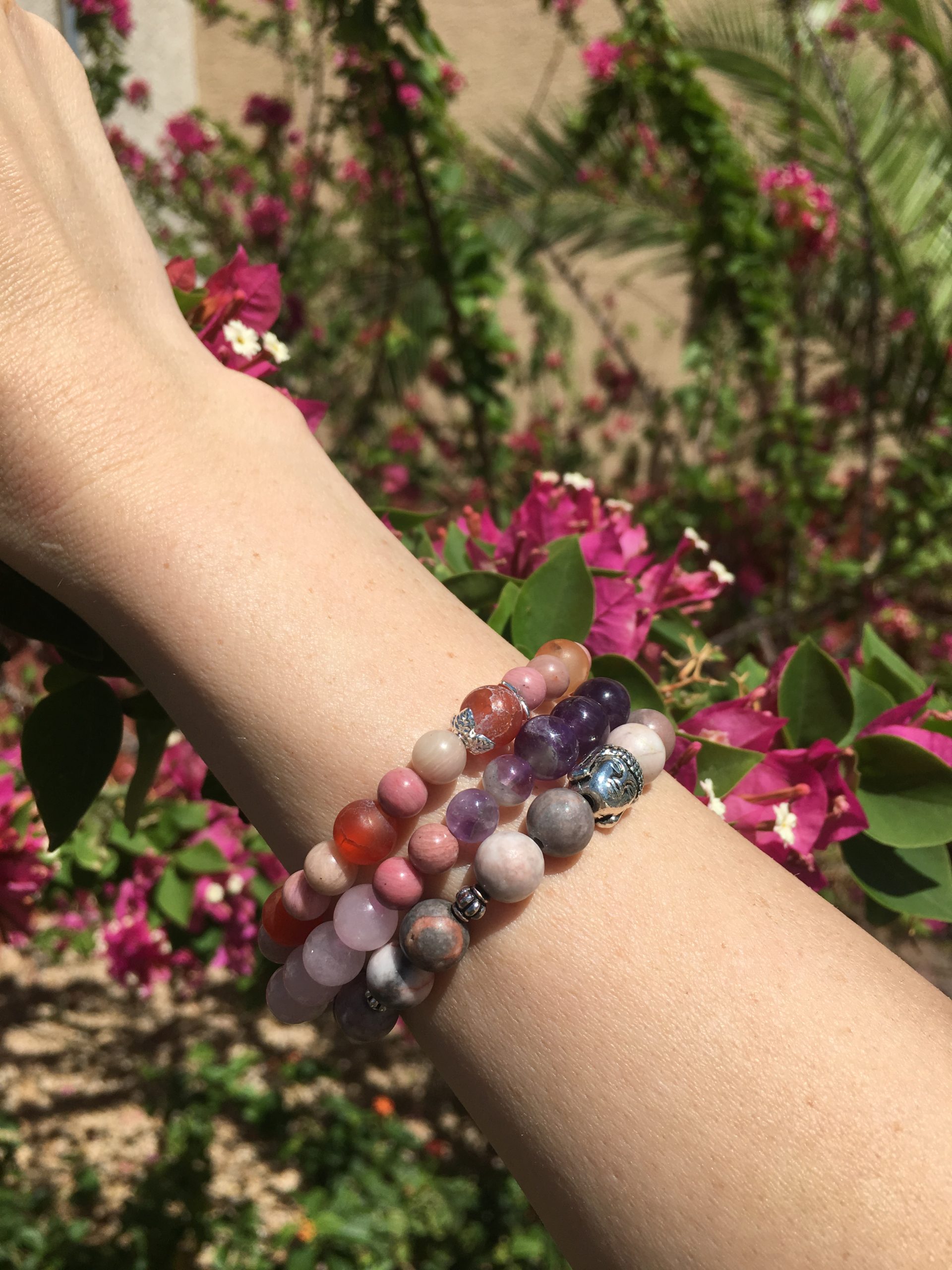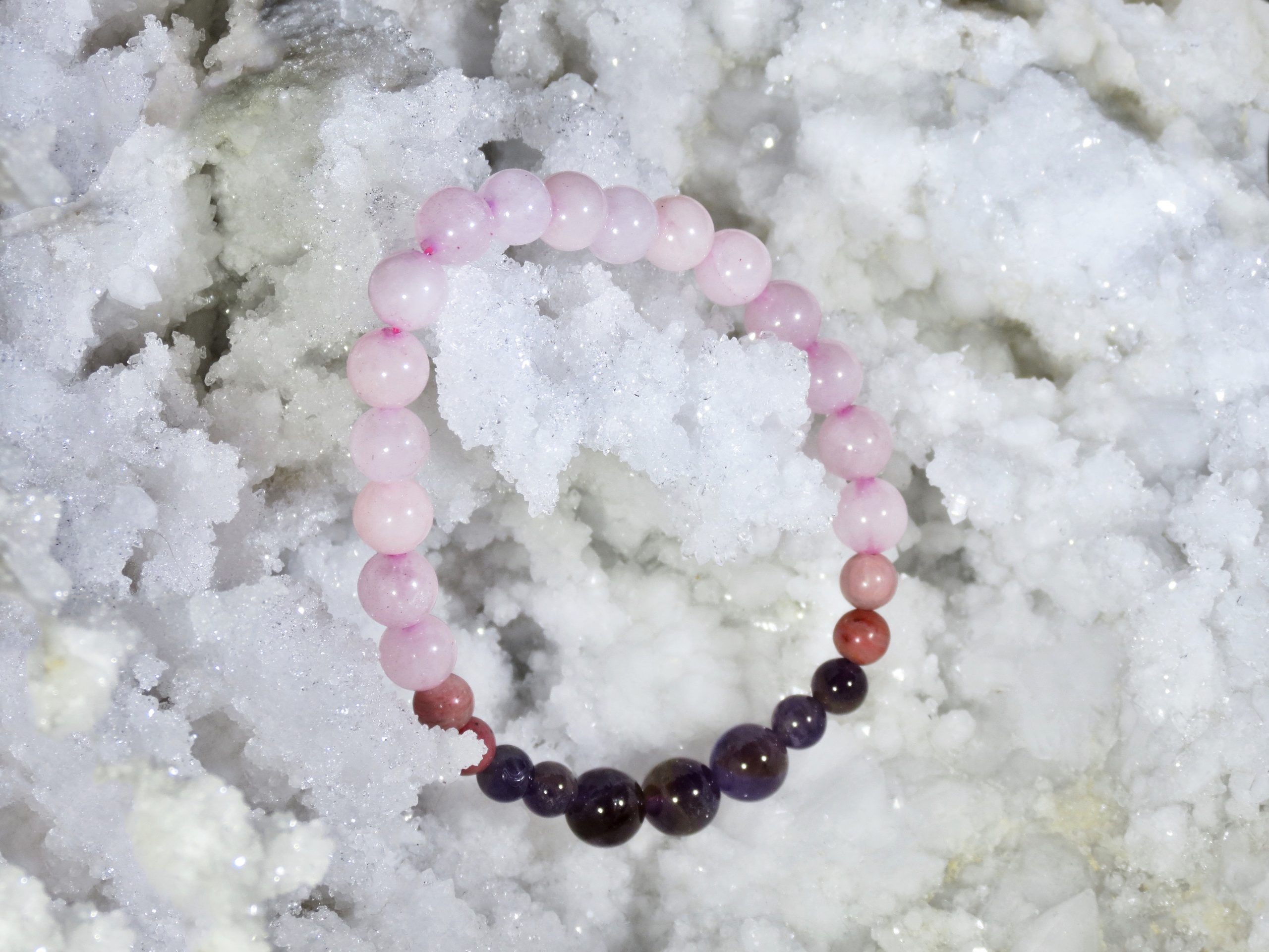 Rose Quartz, Amethyst, and Rhodonite. Whimsical and Delicate protected love