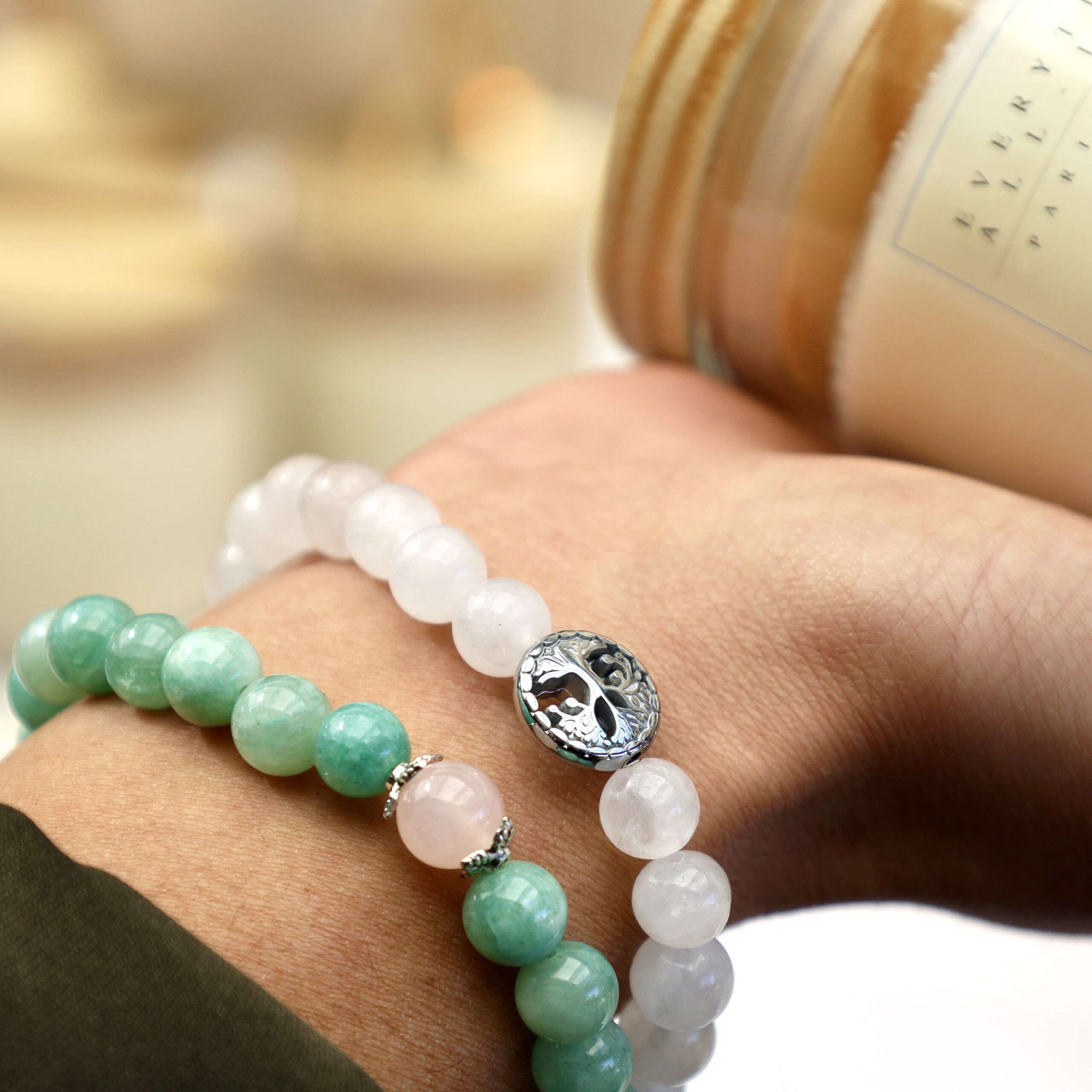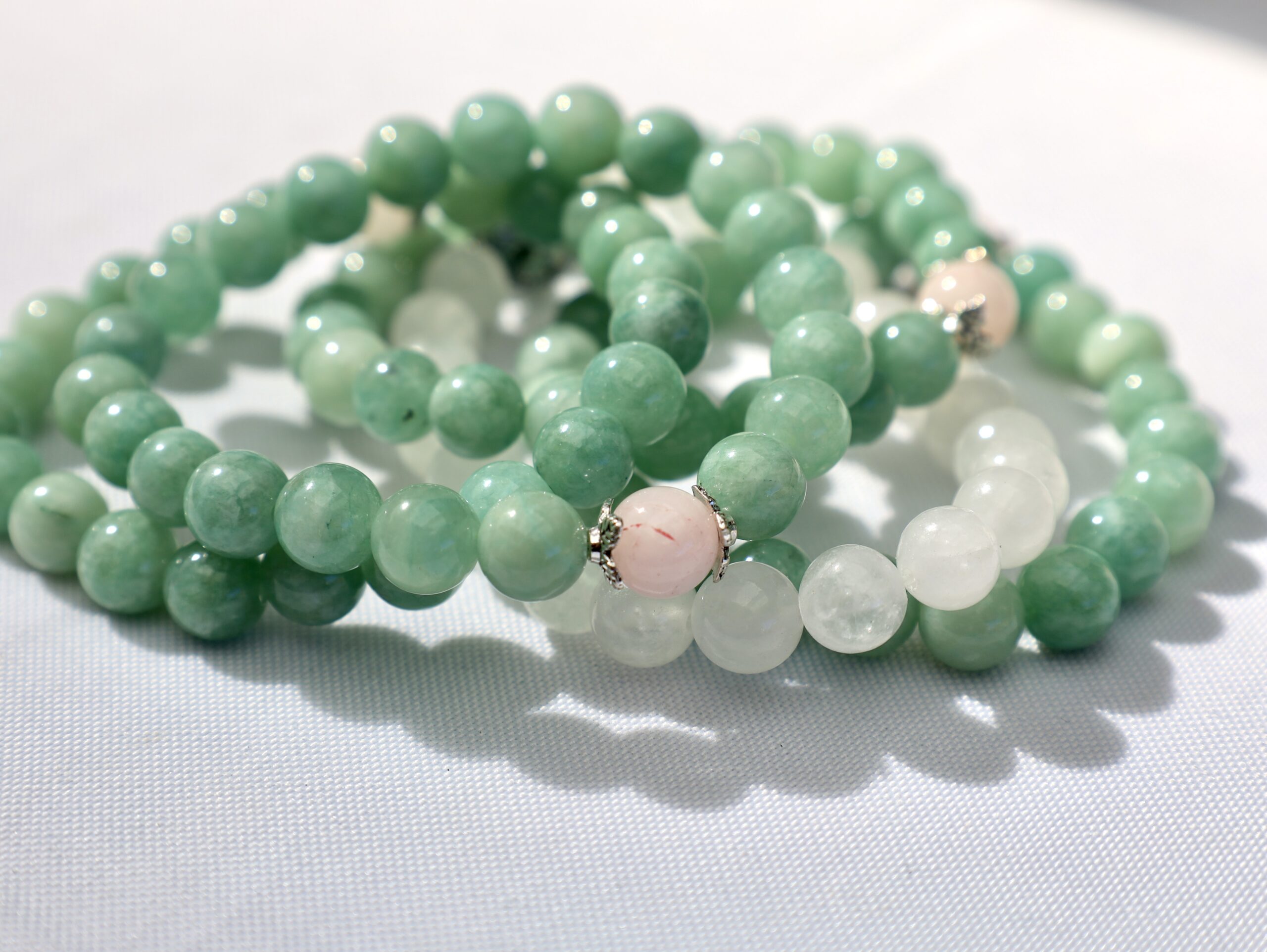 Jade and Rose quartz. This peaceful combination promotes love, luck, and positivity.